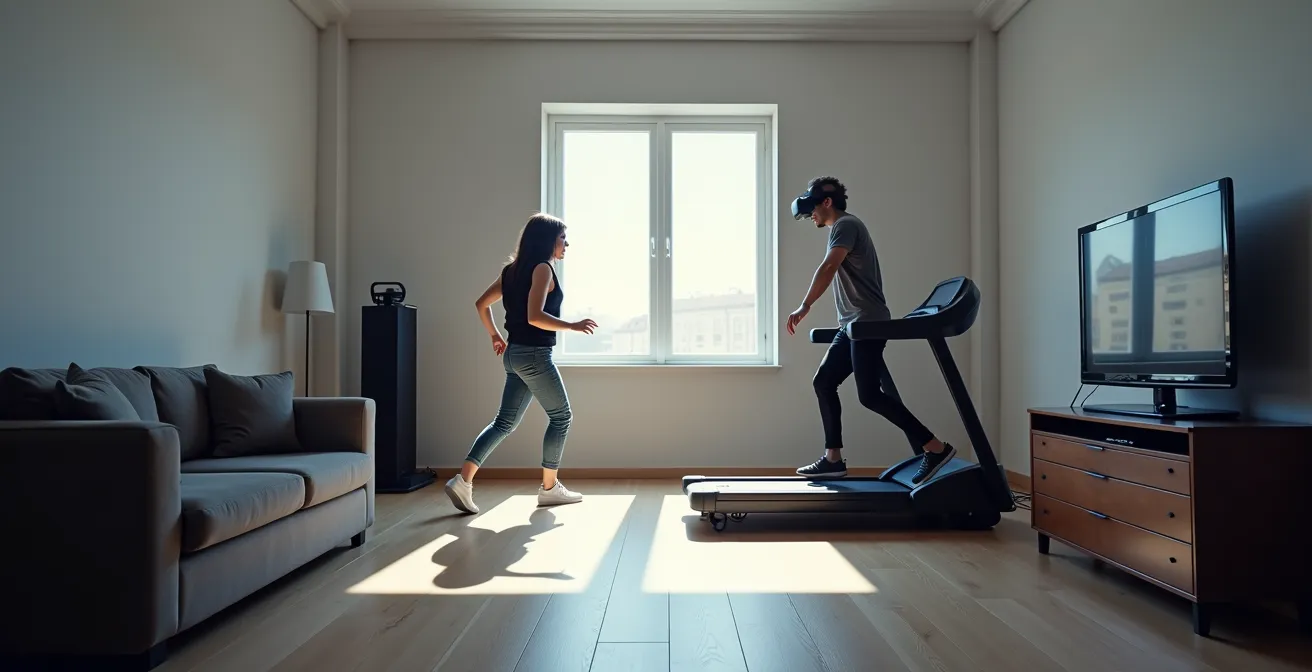 Au-delà du placement, l’optimisation de l’espace passe par des astuces pratiques. Un système de gestion des câbles avec des poulies rétractables fixées au plafond est indispensable pour éviter de s’emmêler et de briser l’immersion. De même, l’installation de dalles anti-vibrations sous la plateforme permet non seulement de protéger votre sol, mais aussi d’isoler phoniquement l’équipement pour vos voisins. La dernière étape, cruciale, est de synchroniser parfaitement le « guardian » (la zone de jeu virtuelle) de votre casque VR avec la zone physique de votre tapis pour une sécurité maximale.