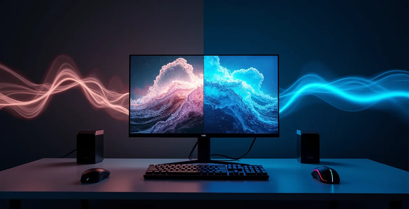 Le choix de l’écran est aussi crucial que celui de la carte graphique, surtout pour les jeux narratifs qui reposent sur l’ambiance. Dans une pièce sombre, la capacité d’un écran à afficher des noirs parfaits est déterminante. C’est sur ce point que la technologie OLED surclasse très largement la technologie IPS. Un écran IPS utilise un rétroéclairage constant qui traverse une couche de cristaux liquides. Même en affichant une image noire, une partie de cette lumière « fuit » (phénomène de « IPS glow » ou « backlight bleed »), transformant les noirs profonds en gris sombres, ce qui nuit à l’immersion.